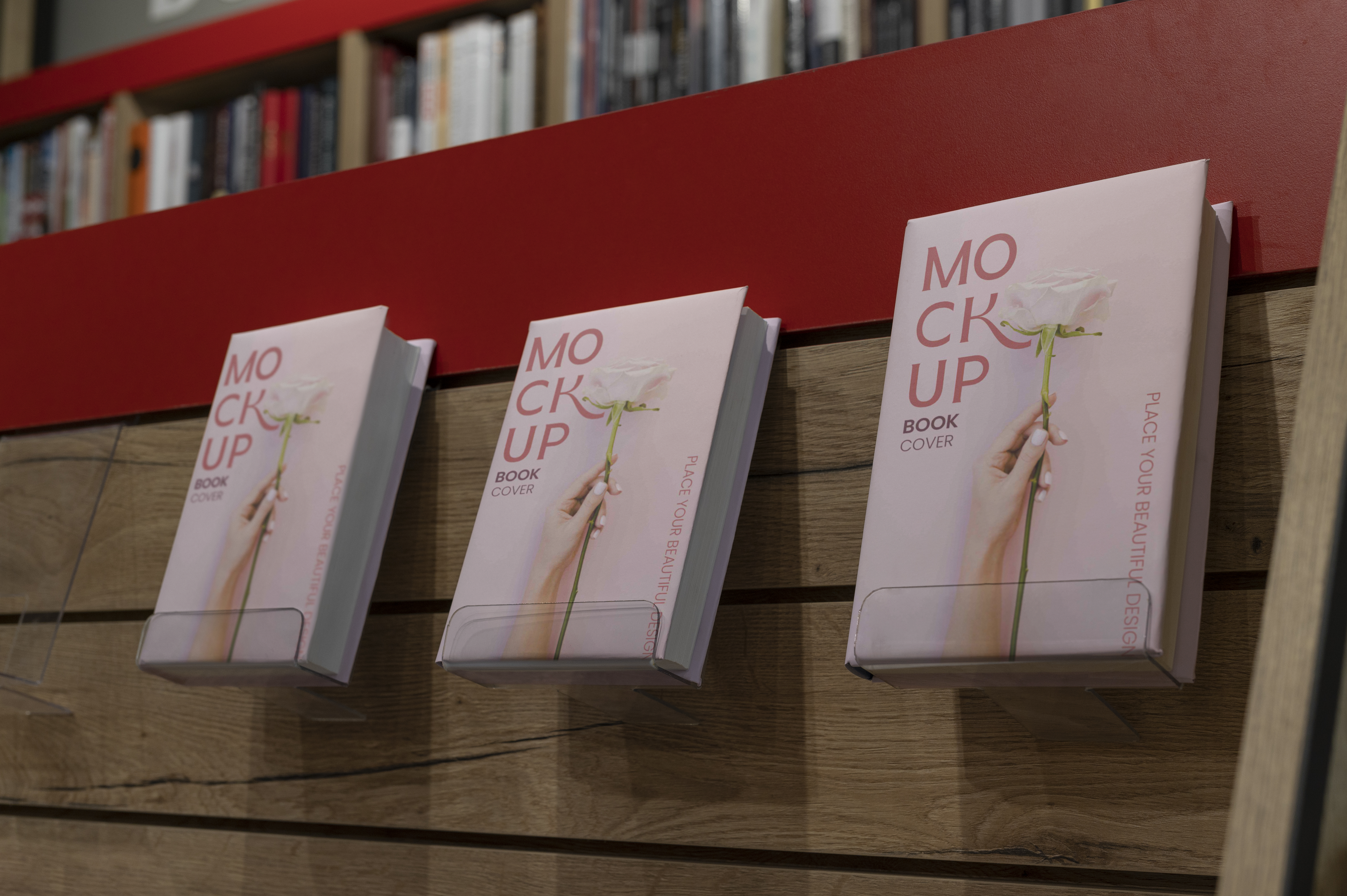 The mockup image depicts a row of books displayed on a wooden shelf in a bookstore setting. The background features a red trim and rows of colorful books. The main object, a book cover, showcases a minimalist design with a centered image of a hand holding a white rose. Use this mockup to visualize and advertise book cover designs effectively. Try our mockup generator today and share your stunning creations on social media to captivate your audience!