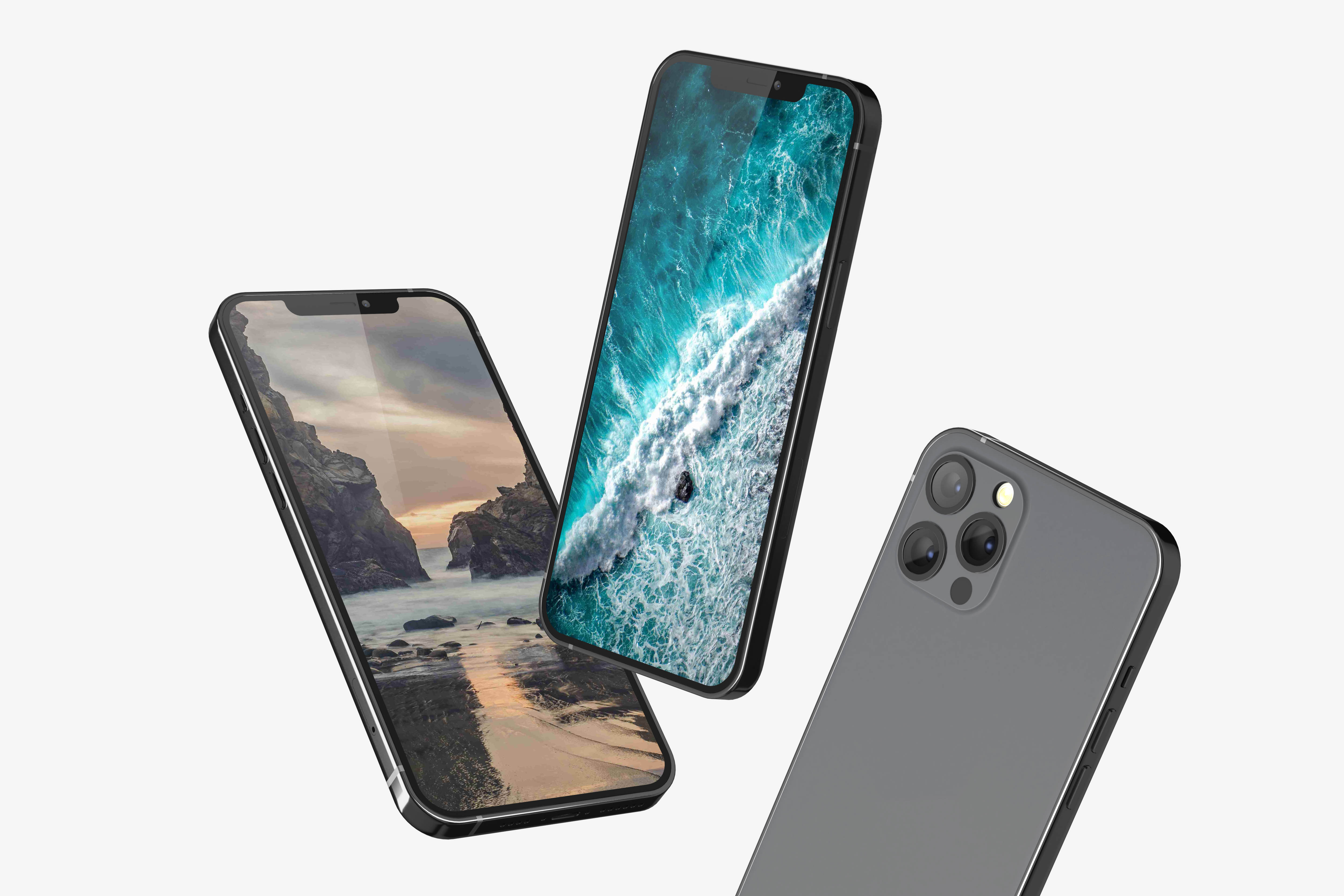 The mockup image features three sleek smartphones set against a simple white background. The phones, with edge-to-edge displays, showcase high-definition nature images. One phone displays a serene beach, another depicts an ocean wave, while the third shows the rear camera array. This mockup is ideal for advertising mobile phones, apps, or digital artwork. Use this mockup generator to visualize your designs and share your creativity on social media!