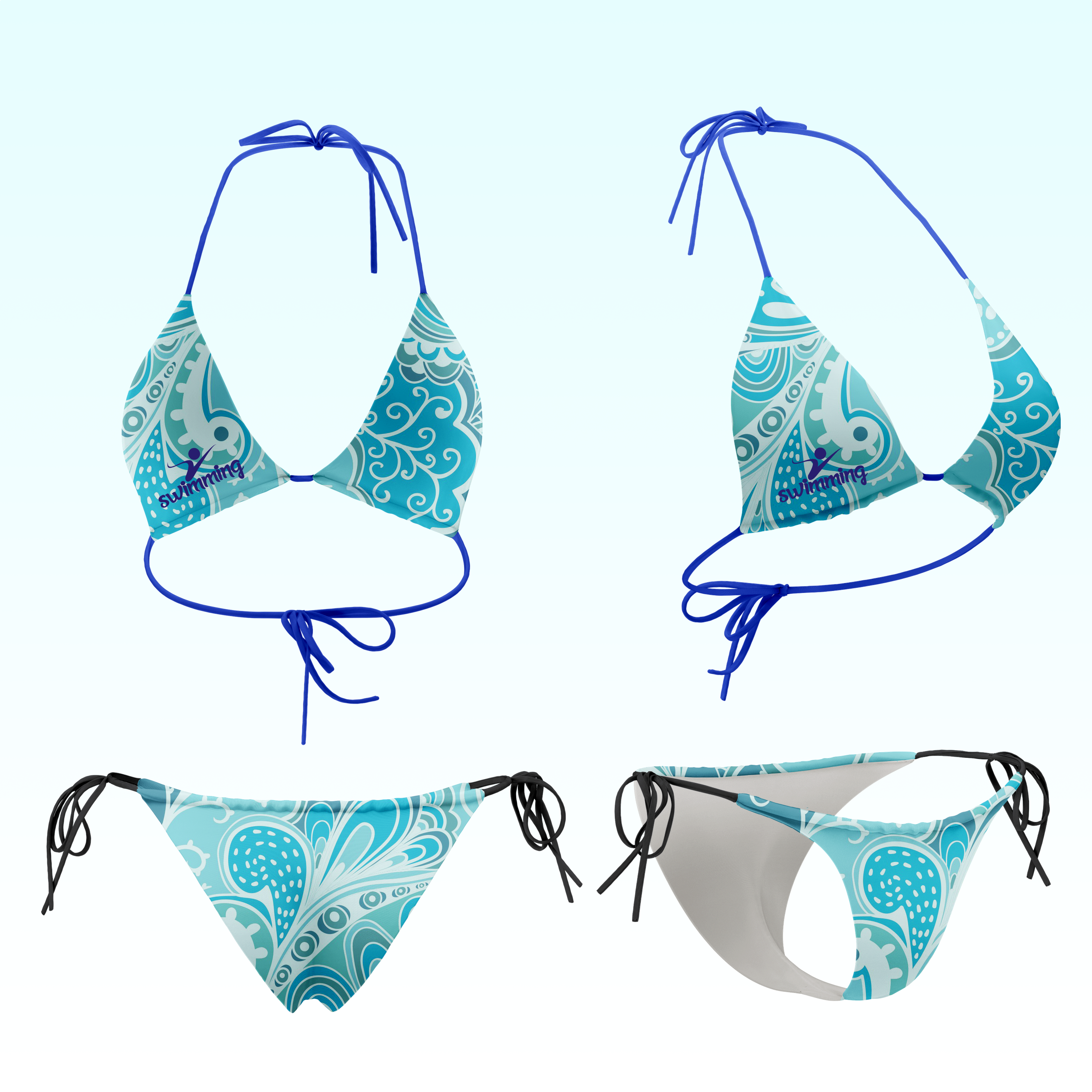 This mockup showcases a bikini set with an intricate blue and white swirl pattern. The bikini top and bottoms are displayed from both front and side views, highlighting the adjustable ties in blue and black. The setting is a simple gradient background fading from white to light blue, emphasizing the swimsuit design.