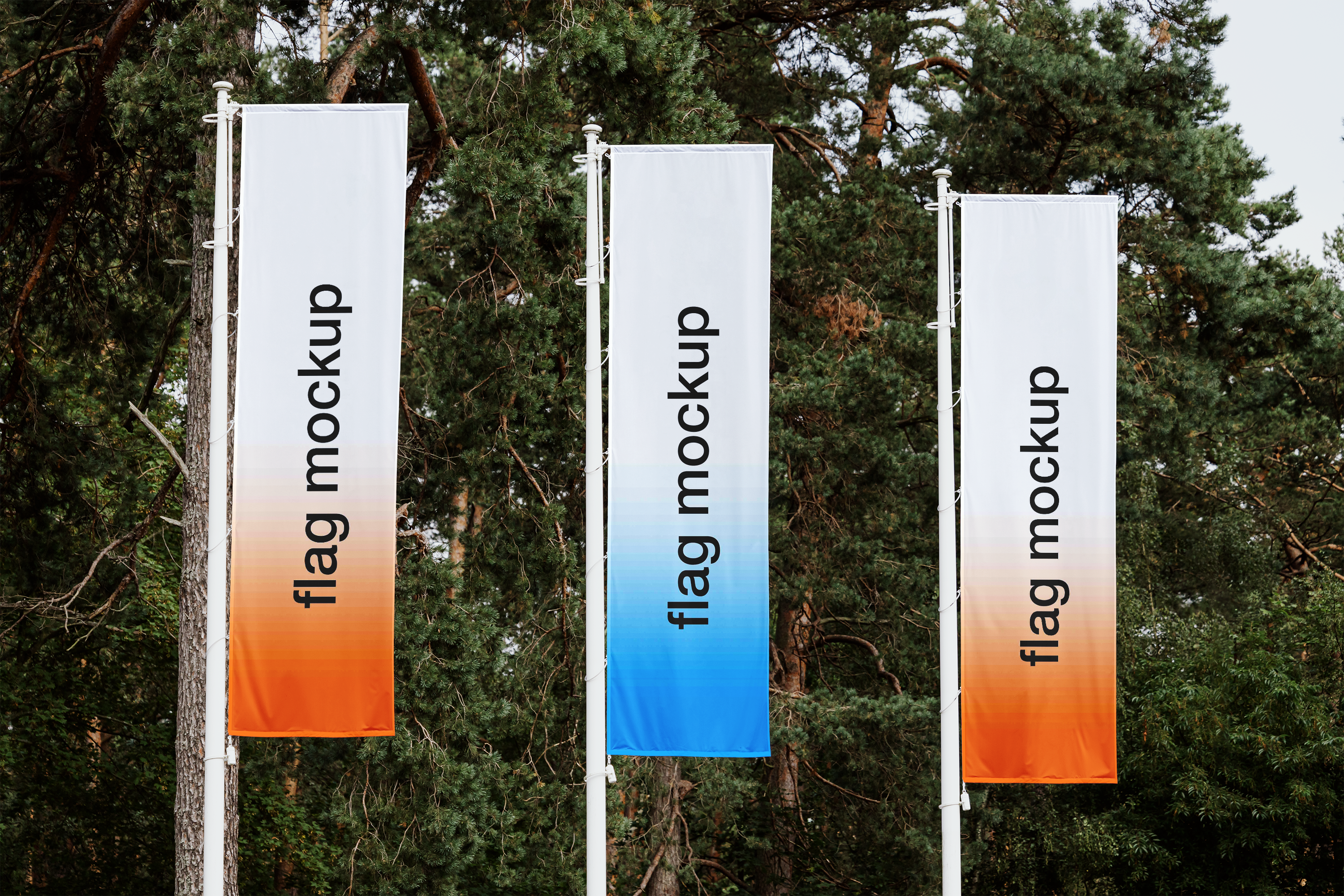 This mockup image features three vertical flags against a backdrop of lush green pine trees, creating a serene outdoor setting. The flags have a clean design with a gradient effect transitioning from white to orange and blue. Use this versatile mockup to showcase your branding or promotional designs effectively. Perfect for outdoor events, festivals, or business adverts. Utilize our mockup generator to customize your design and share your creation on social media to captivate your audience. Start now!