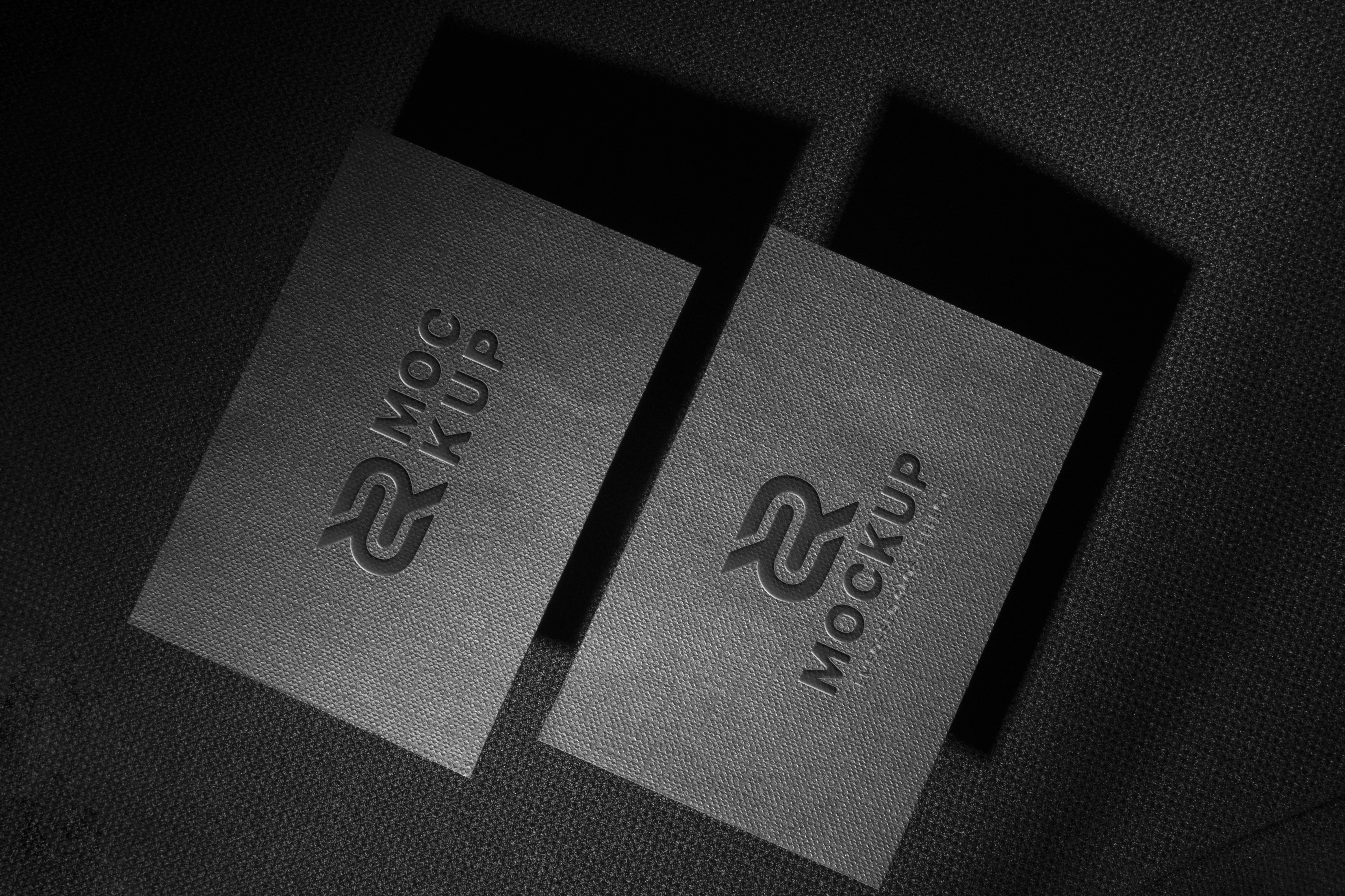The mockup image showcases two textured business cards positioned diagonally on a dark, fabric-textured background. The cards feature a sleek, embossed logo design showcasing a minimalistic emblem and modern typography. This mockup is ideal for presenting your branding in a sophisticated and professional manner. Use it for advertising by showcasing your logo or business card design to potential clients. Try out the mockup generator today and share your stunning design on social media for broader engagement!