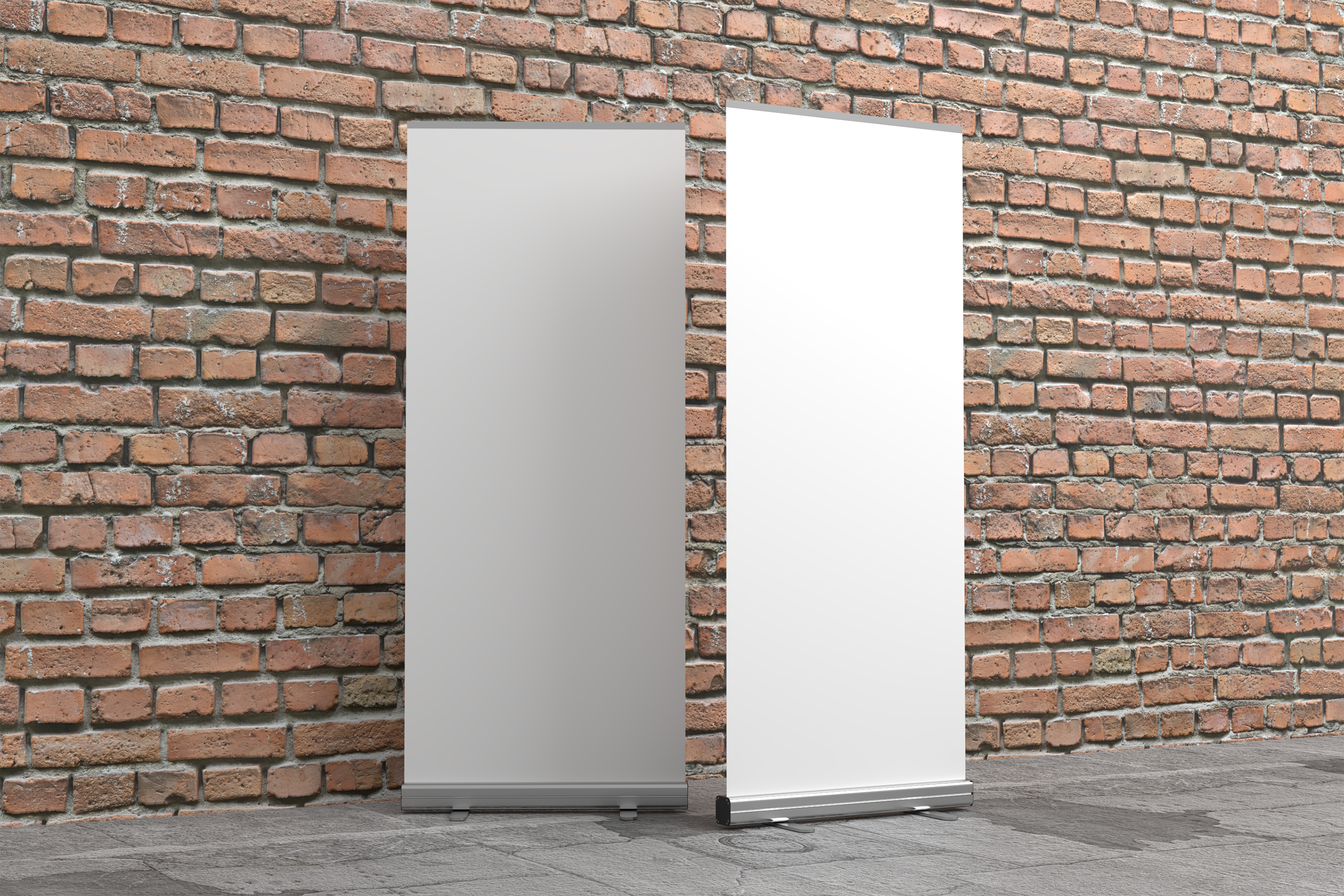 The mockup image features two vertical banners against a rustic brick wall background, situated on a paved ground. The main objects of the mockup are sleek, blank pull-up banners with silver-colored bases, offering ample space for custom designs or advertisements. This setting highlights the banners, making them ideal for promoting products and services in an urban context. Use this mockup generator to create eye-catching designs and share your creations on social media to attract more attention and drive engagement!