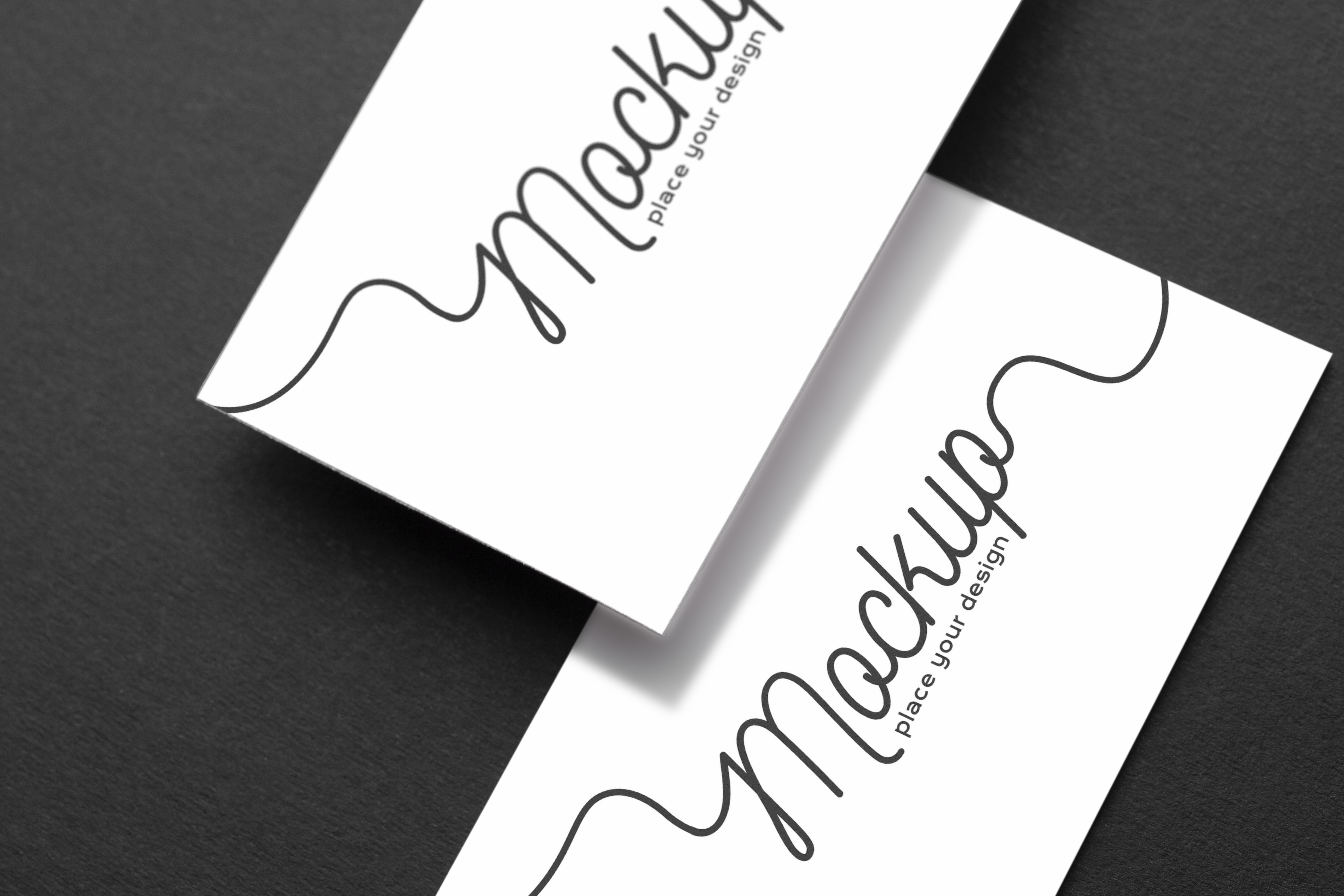 The mockup image features two business cards set against a dark, textured background. The cards are white with elegant, cursive text and simple design elements. The clean, minimalist style makes it ideal for showcasing your brand identity in a professional and visually appealing way. Use this mockup for advertising your business or personal brand. Try our mockup generator now and effortlessly create stunning designs to share on social media!