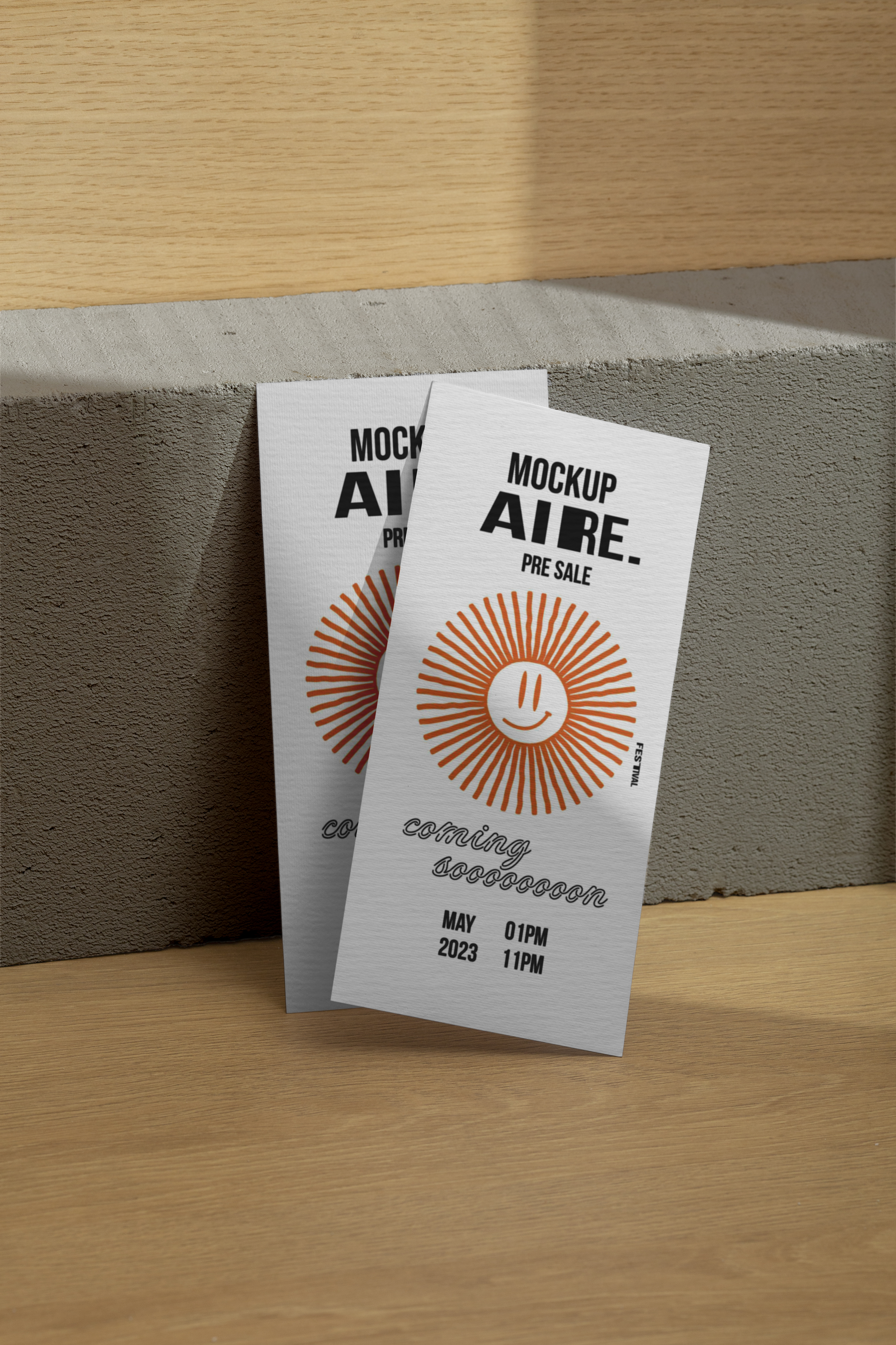 The mockup image features two white event cards leaning against a gray concrete block in a neutral-toned, minimalistic setting with a wooden background. The cards display a vibrant, orange sunburst design with a central smiley face. Use this mockup to promote event pre-sales or announcements, showcasing your designs in a professional setting. Utilize the mockup generator to create eye-catching flyers and share your designs on social media for maximum reach. Try it now!