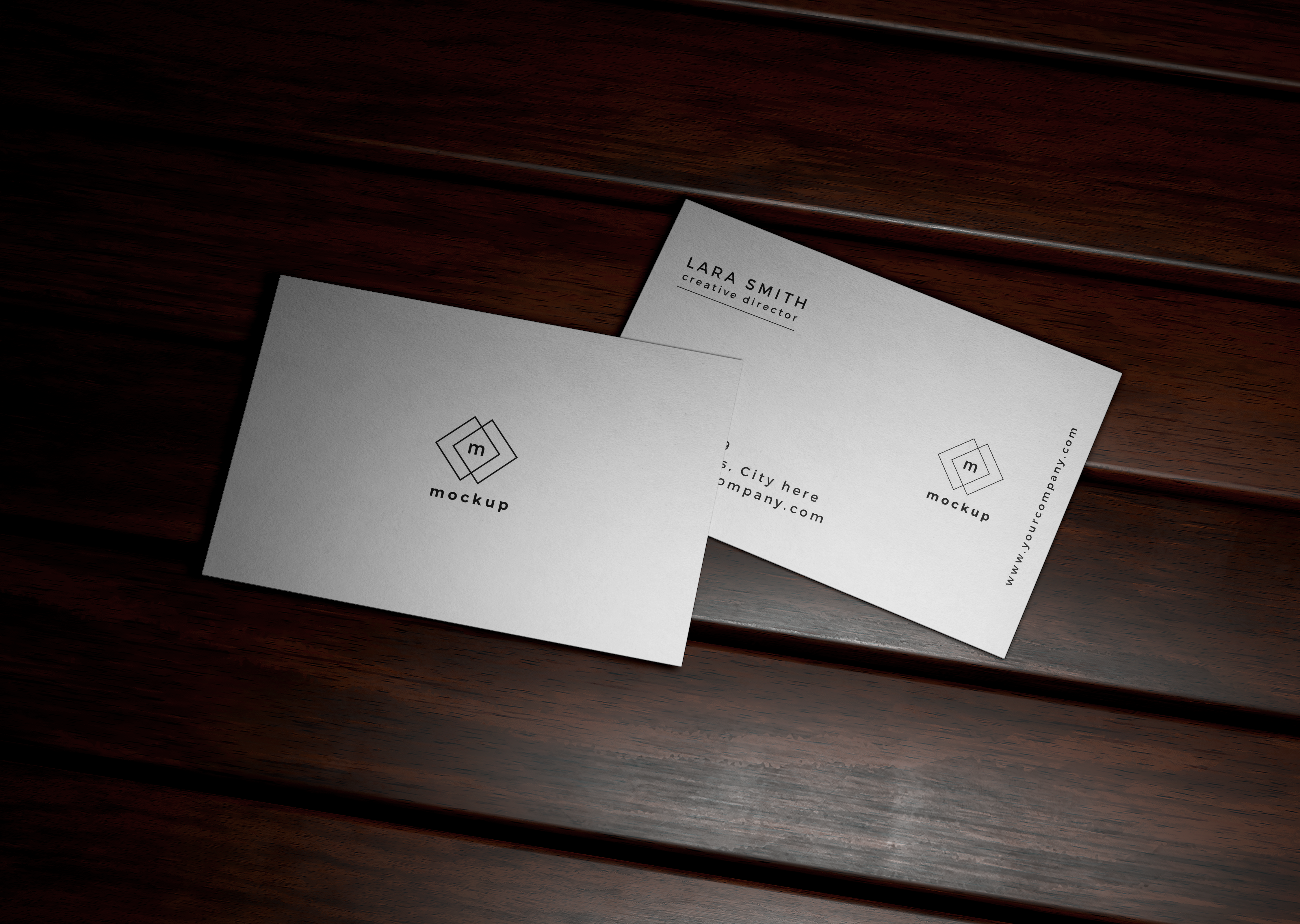 Two business cards with a minimalistic mockup design lying over a dark wooden surface.