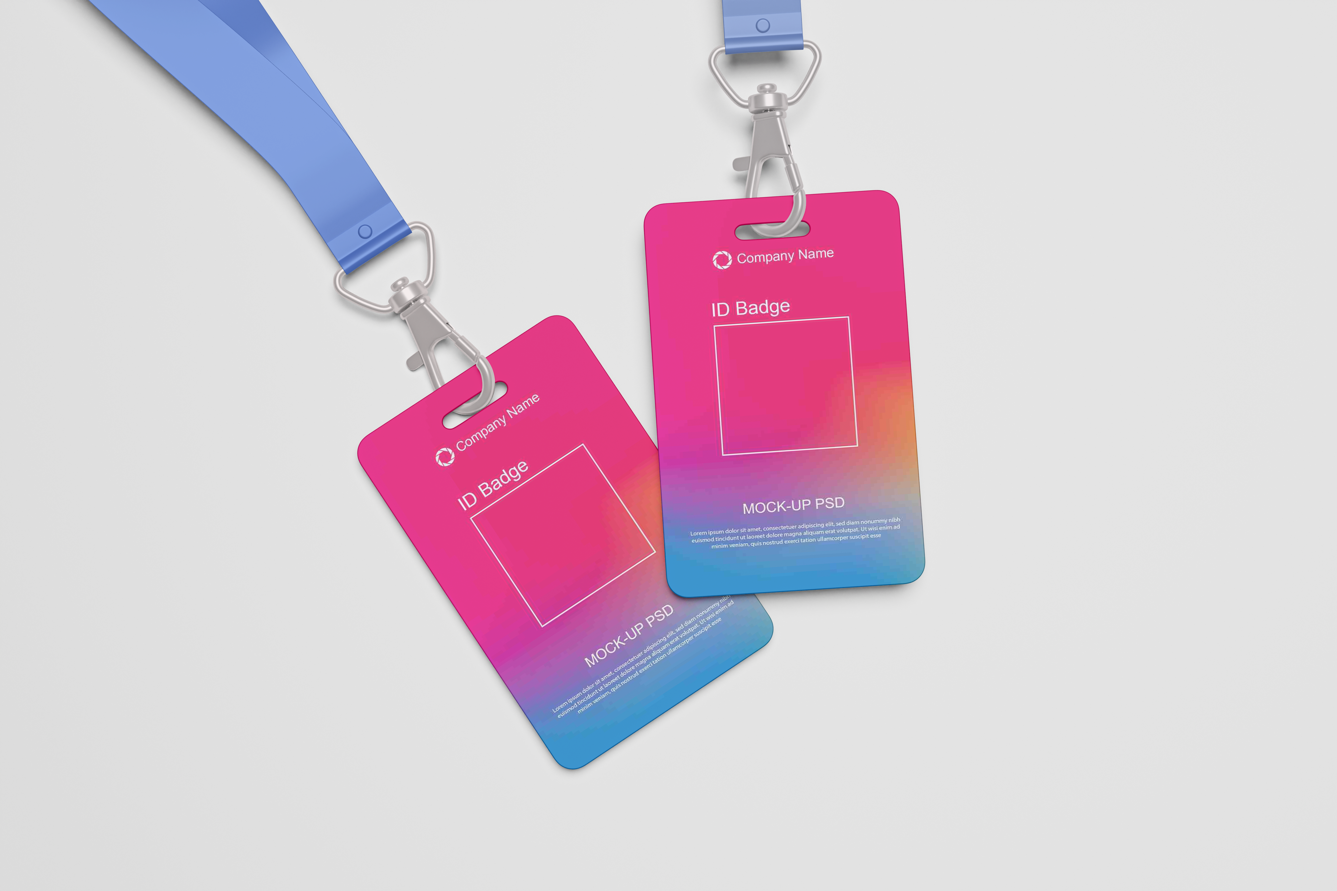The mockup image features two ID badges with blue lanyards against a white background. The badges display a vibrant gradient design transitioning from pink to blue with a placeholder for an image. This mockup is ideal for showcasing corporate ID badge designs, creating a professional presentation for your business materials. Use this mockup generator to visualize your brand’s ID badge, then share your customized design on social media to boost your marketing efforts and enhance brand recognition!