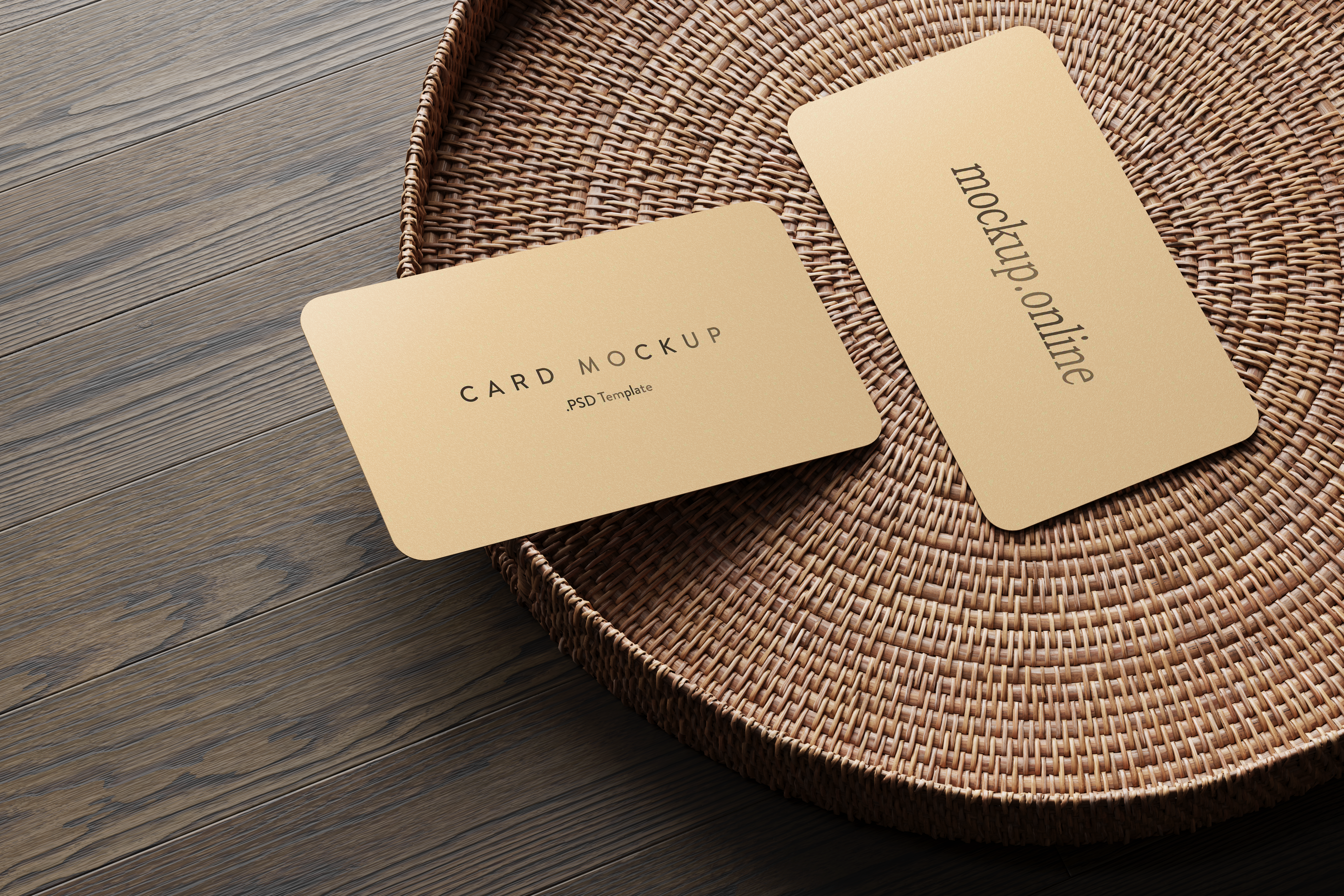 The mockup image depicts two beige business cards with rounded edges placed on a woven wicker dish. The background features a rustic wooden surface, providing a warm and natural setting. One card is angled, lying partially over the other, emphasizing the design details and clarity of print. This mockup is ideal for showcasing business card designs in a professional yet earthy setting. Use this mockup generator to create your personalized design and share it on social media to attract attention and potential clients!