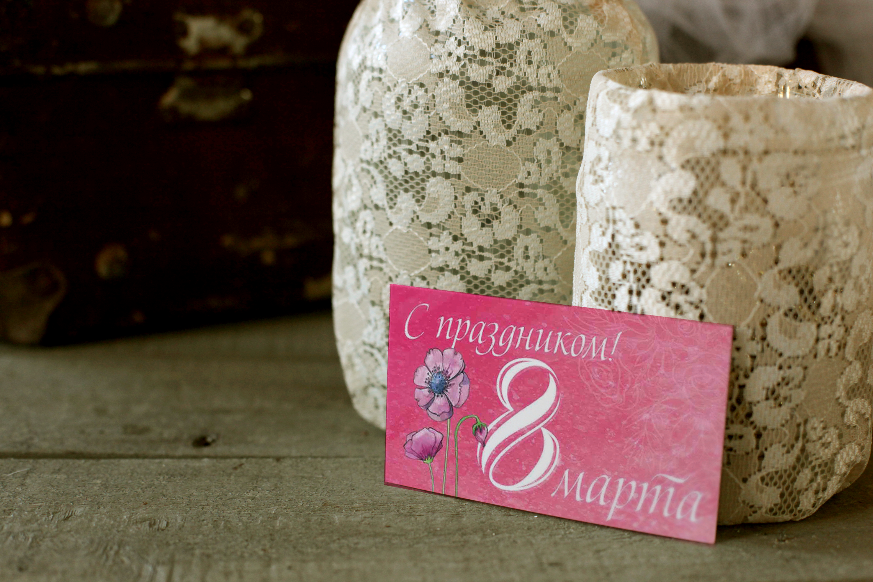 Two decorative ceramic vases next to a pink card template celebrating International Women's Day on March 8, placed on a wooden surface.