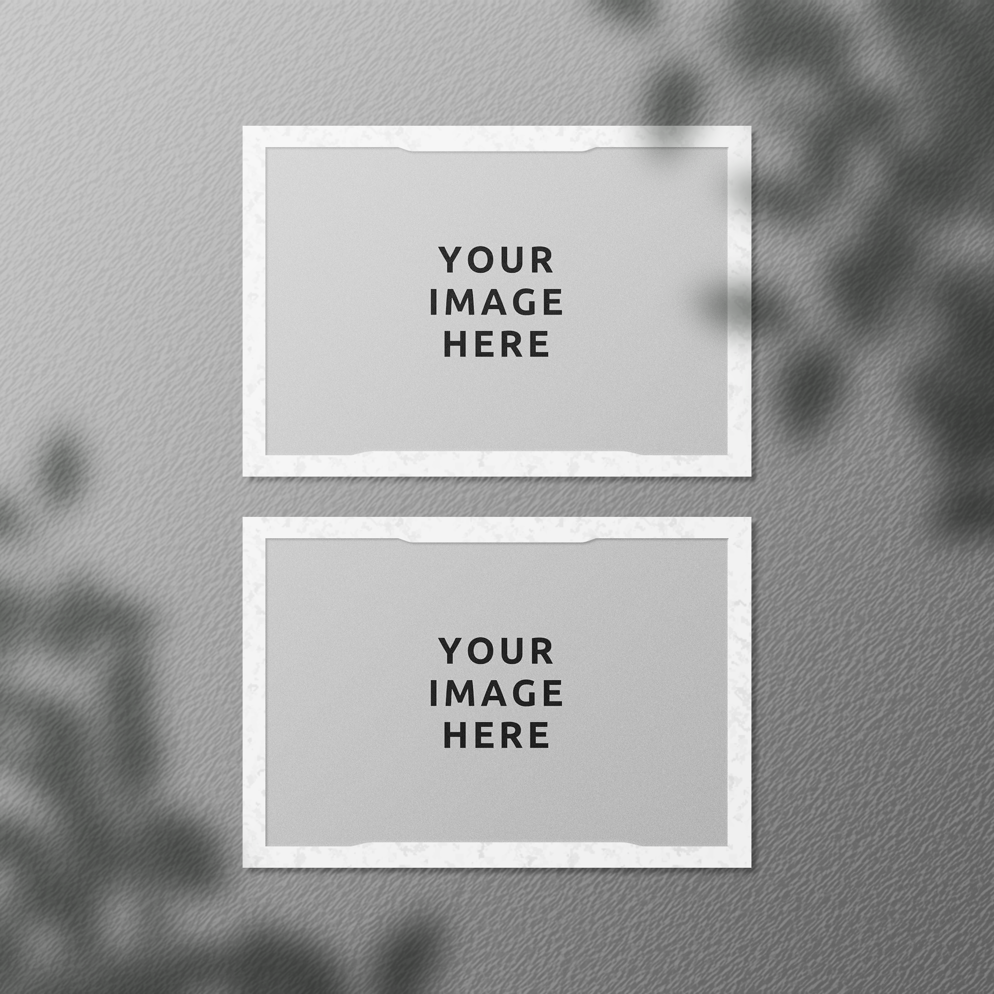 The mockup image displays two minimalist rectangular frames positioned vertically against a textured, light grey background with soft, blurred shadows. The frames, featuring a subtle marble design, have a placeholder for inserting custom images. This clean and elegant setup can be used to advertise art prints, photos, or graphic designs in a refined context. Utilize this mockup generator to showcase your artwork effortlessly and share your stunning designs on social media to captivate your audience!