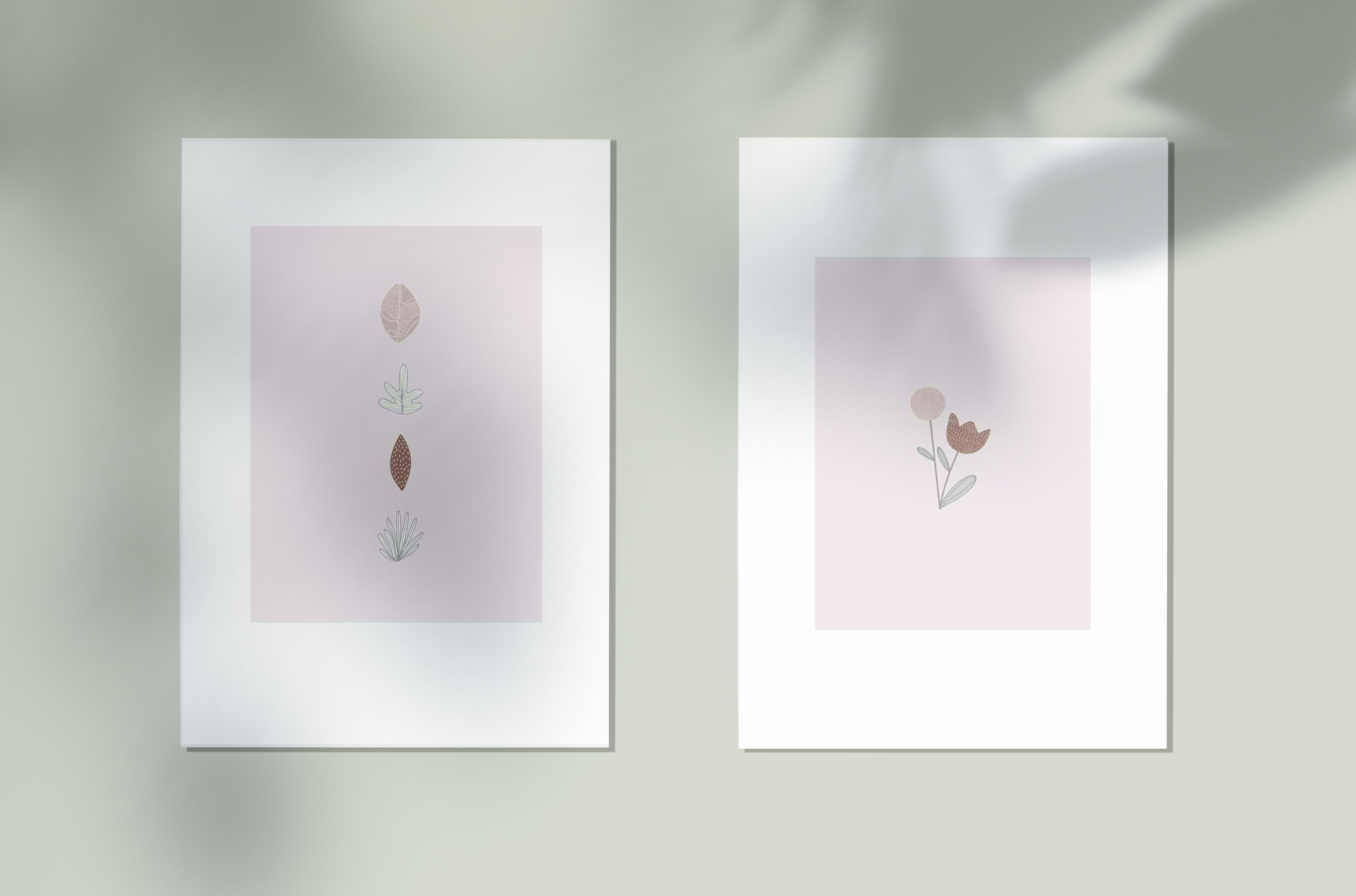 The mockup image features two framed minimalist botanical prints displayed against a soft gray background. The left print showcases four different leaf designs aligned vertically, while the right print highlights a simple floral illustration with delicate detailing. Subtle shadowing adds depth to the serene and modern setting. Use this mockup for promoting your botanical or nature-themed artworks. Try our mockup generator today and share your unique designs on social media to captivate your audience!