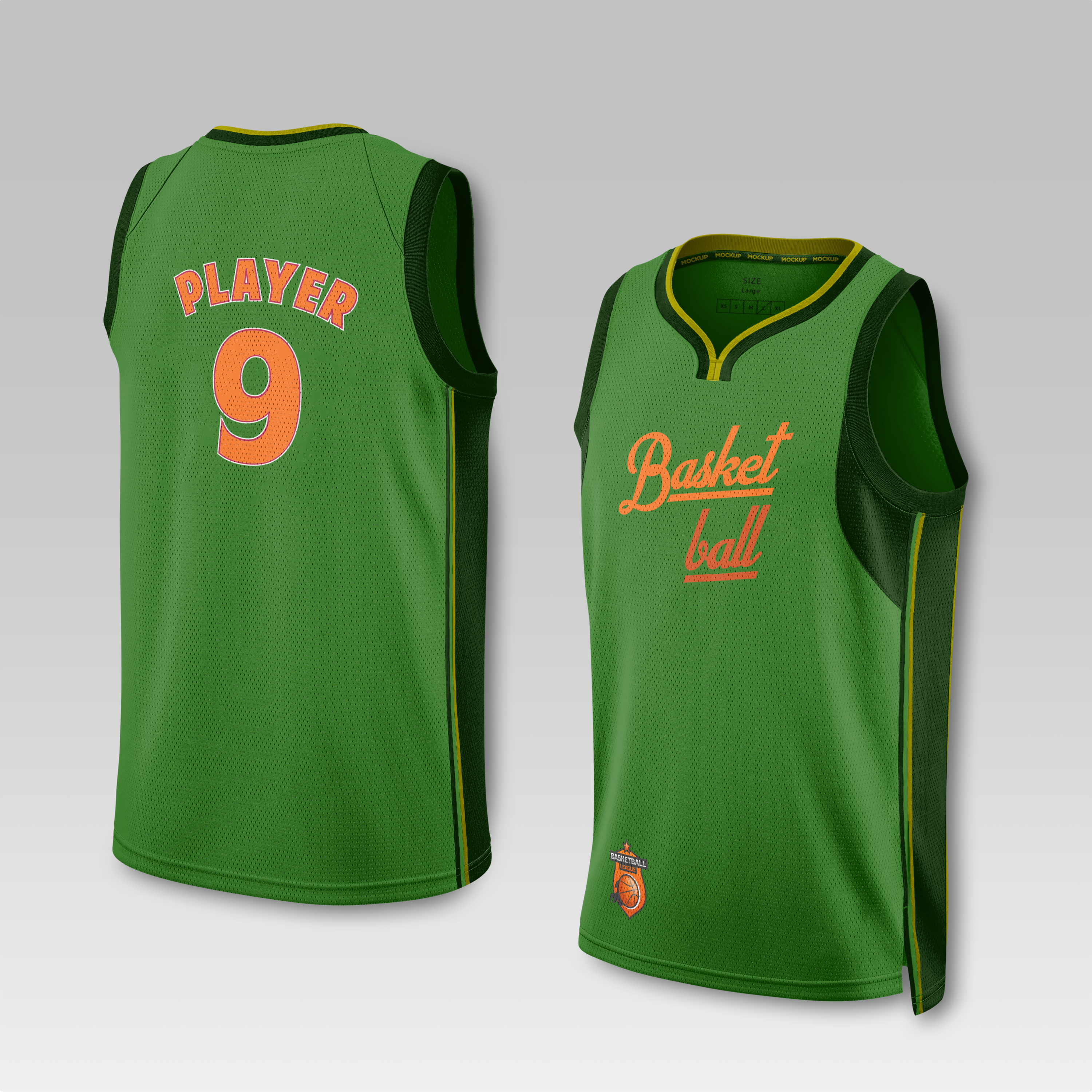 Two green basketball jersey mockups with orange trim, displaying "player 9" and a logo that reads "basketball" on the front.