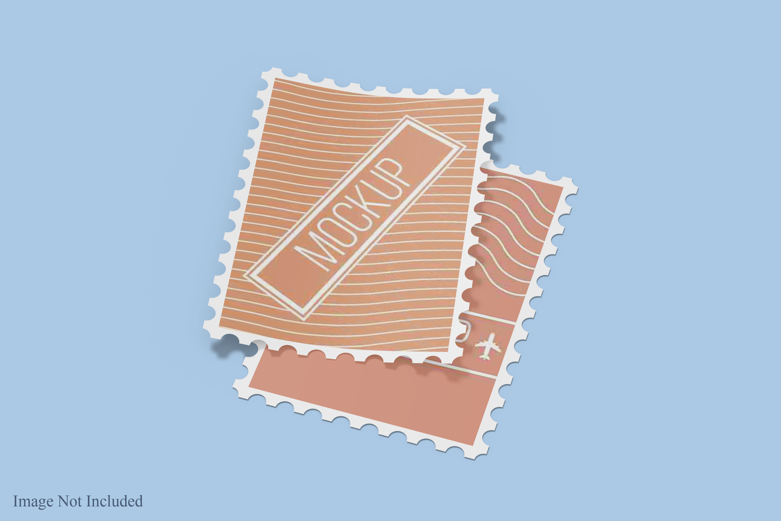 The mockup features two postage stamps on a light blue background. The stamps have a vintage design with a muted orange color scheme, white wavy lines, and a frame around the main area. The top stamp has a rectangular label in the center, while the bottom stamp includes an airplane graphic. This mockup can be used to promote creative postal-themed designs for businesses or events. Use the mockup generator to customize your own stamps and share your unique designs on social media!