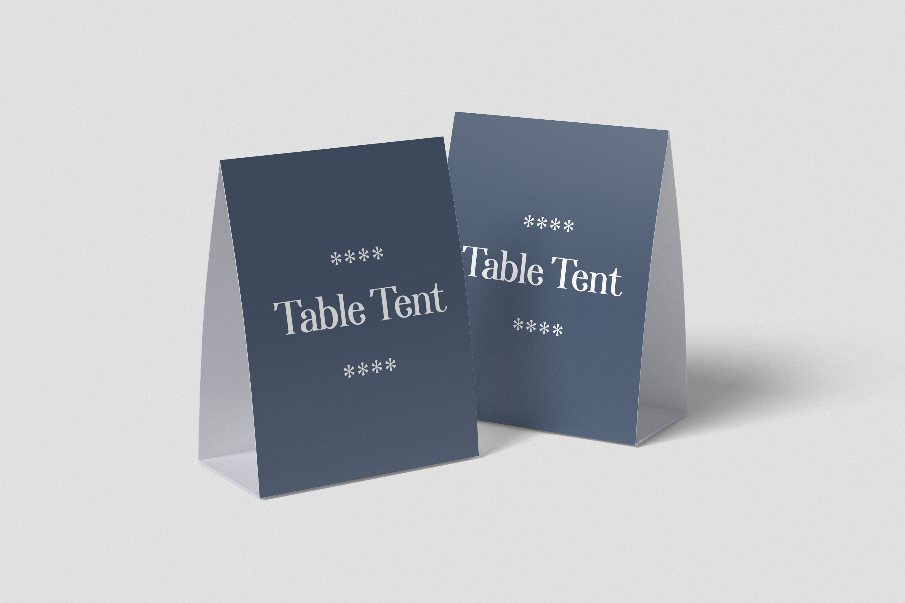 The mockup image shows two table tents standing on a clean, white surface against a plain white background. Each table tent has a sleek, dark blue front face featuring simple, symmetrical asterisk-like designs above and below the text. This mockup is perfect for displaying custom designs for restaurant menus, event details, or promotional messages. Utilize this generator to create and visualize compelling table tent designs, and share your creations on social media to showcase your brand effectively!