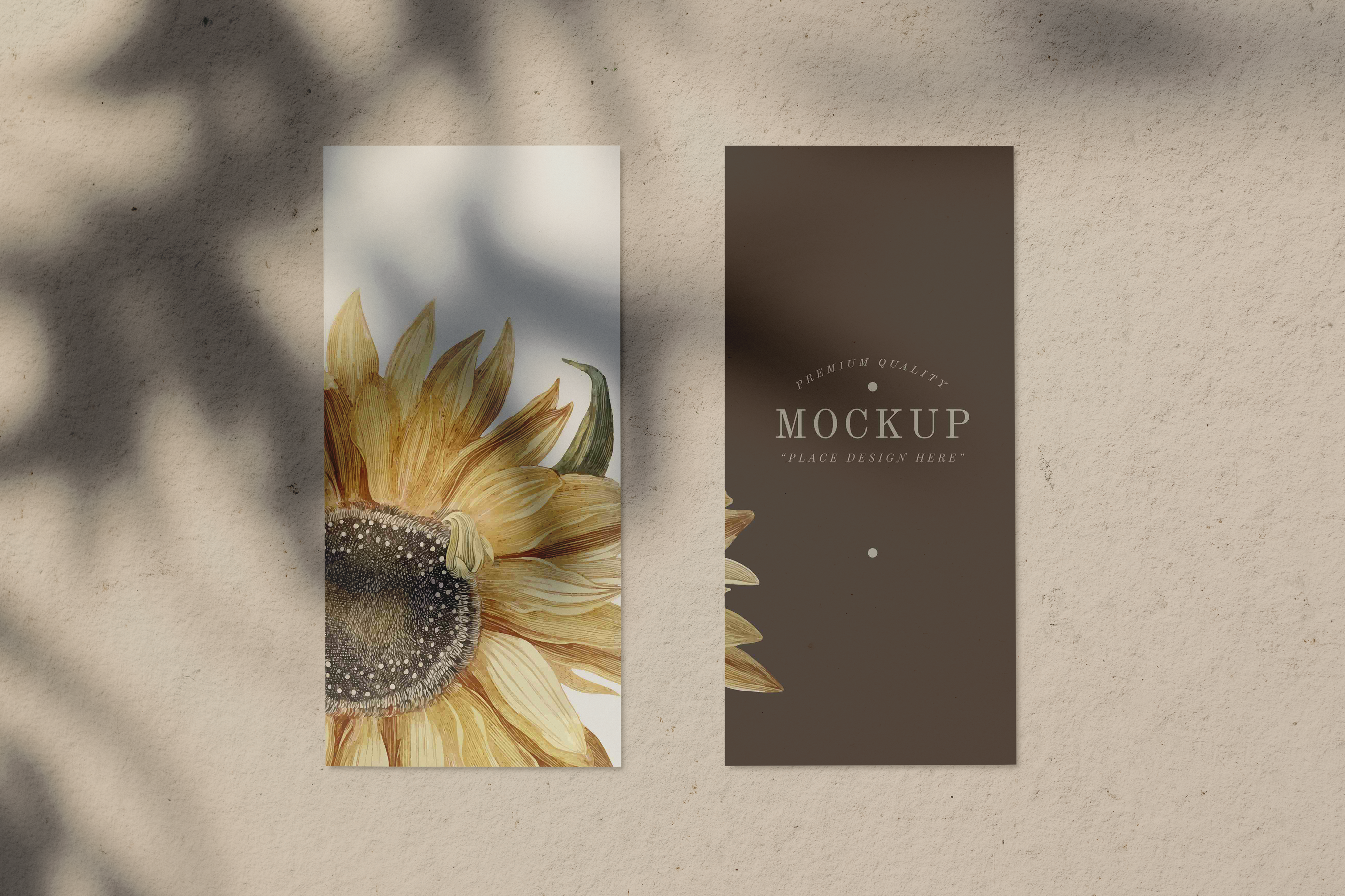 This mockup image presents two vertical banners set against a textured beige background with shadows of tree leaves. The main object is an illustration of a sunflower with detailed petals and a rich, textured center, featured prominently on the left banner. The right banner showcases a minimalist design with room for custom text. Perfect for advertising nature-inspired products or botanical themes, use this mockup generator to create captivating designs and share them on social media to engage your audience effectively. Start now!
