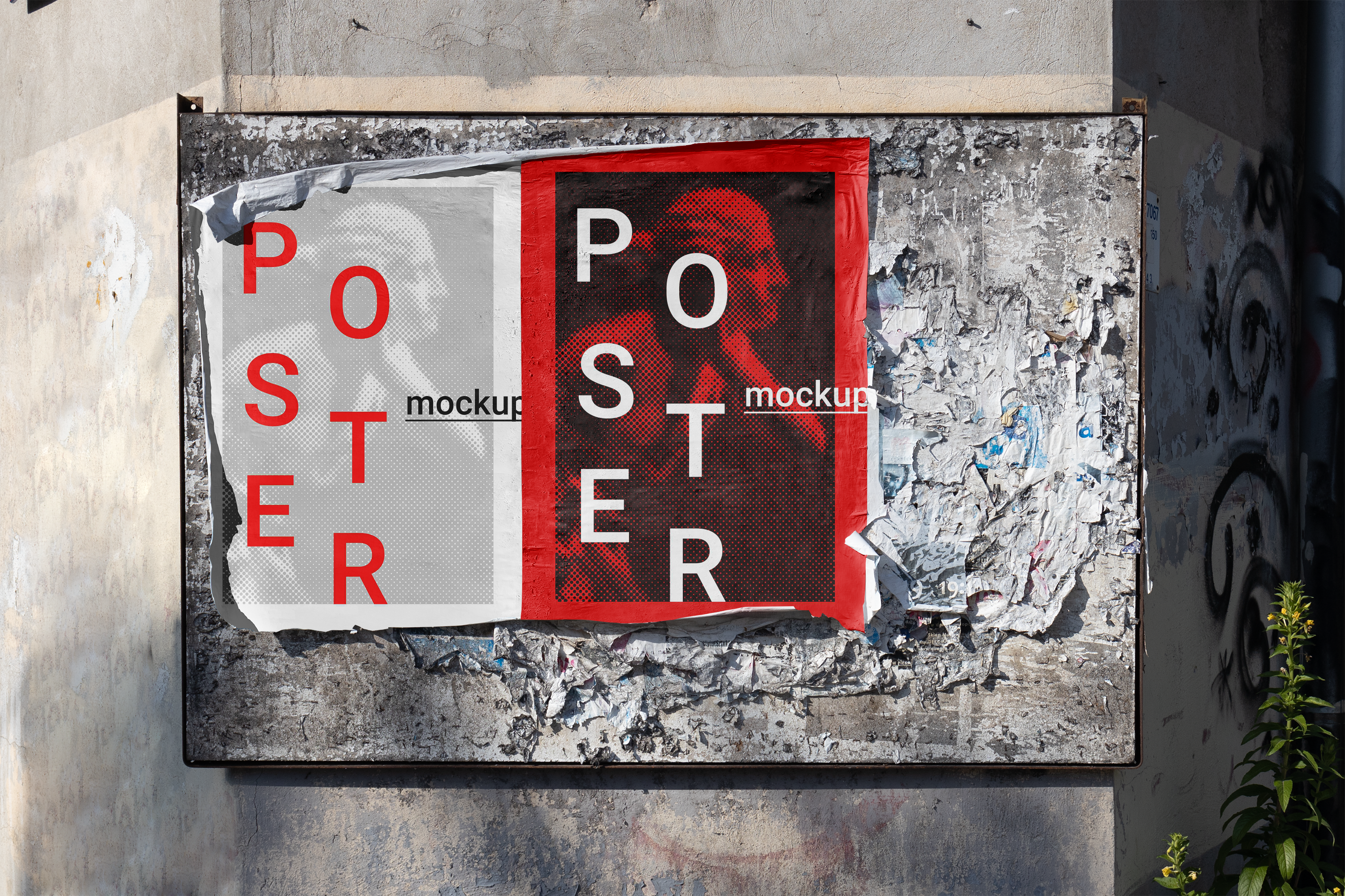 This mockup showcases a double-poster design on a worn, urban wall with remnants of old posters, providing a realistic, gritty background. The left poster is white with red text and graphics, while the right poster contrasts with a dark red and white design. Both feature a classical statue in the background, adding a touch of sophistication. Use this mockup generator to create eye-catching advertisements and share your designs on social media to captivate your audience!