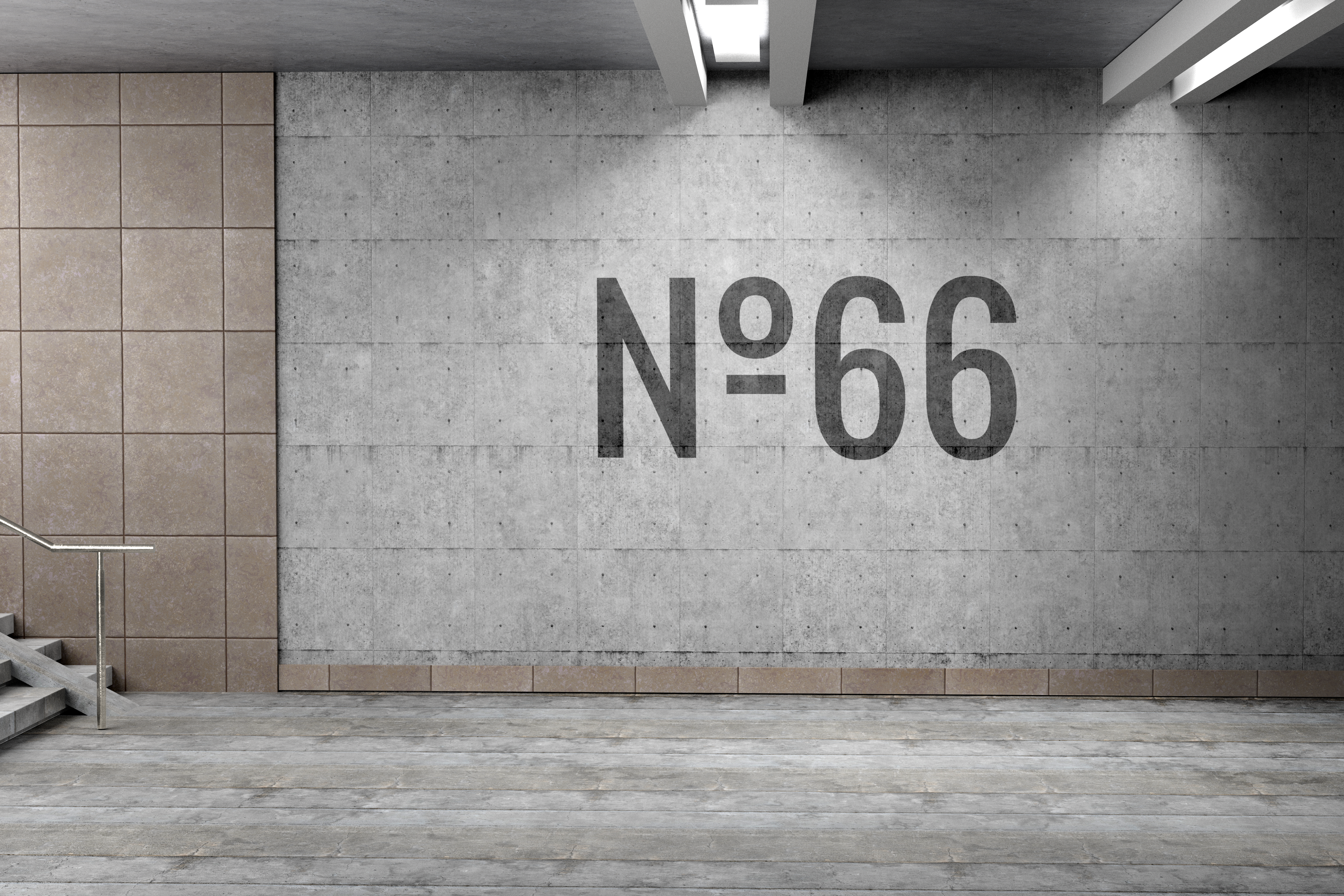 Under a spotlight, the concrete wall features the number "66" painted in bold black letters. Stairs descend from the top left corner. The floor is tiled in a matching gray tone, creating an ideal template setting for interior design mockups.