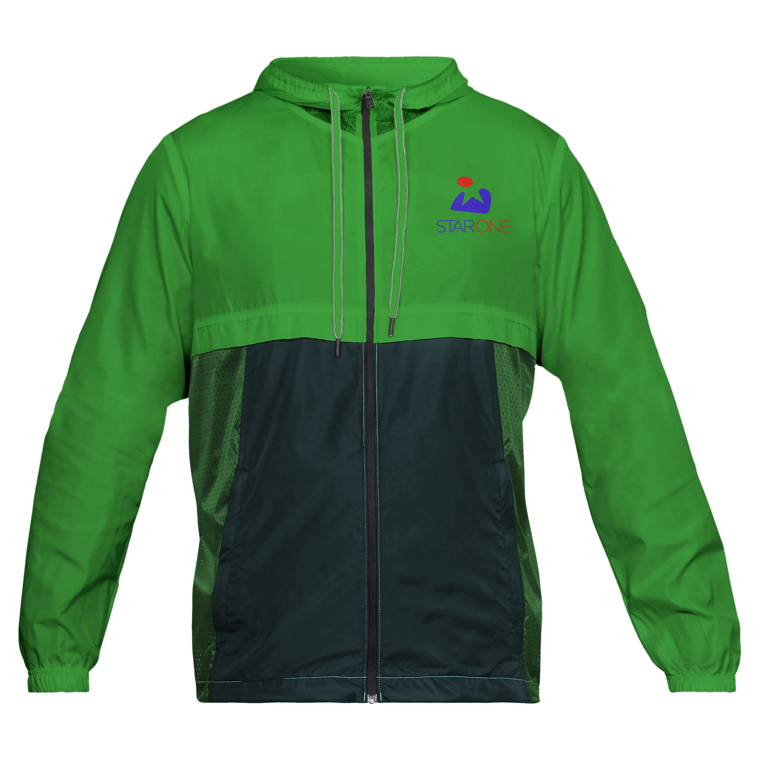 This mockup displays a vibrant green and dark color-blocked windbreaker jacket against a plain white backdrop. The jacket features a front zipper, drawstrings, and an eye-catching logo on the left chest. You can use this mockup to showcase your custom jacket designs for promotional purposes or product launches. Experiment with different logos and color schemes to see what works best. Leverage this mockup generator now and share your striking new designs on social media to captivate your audience!