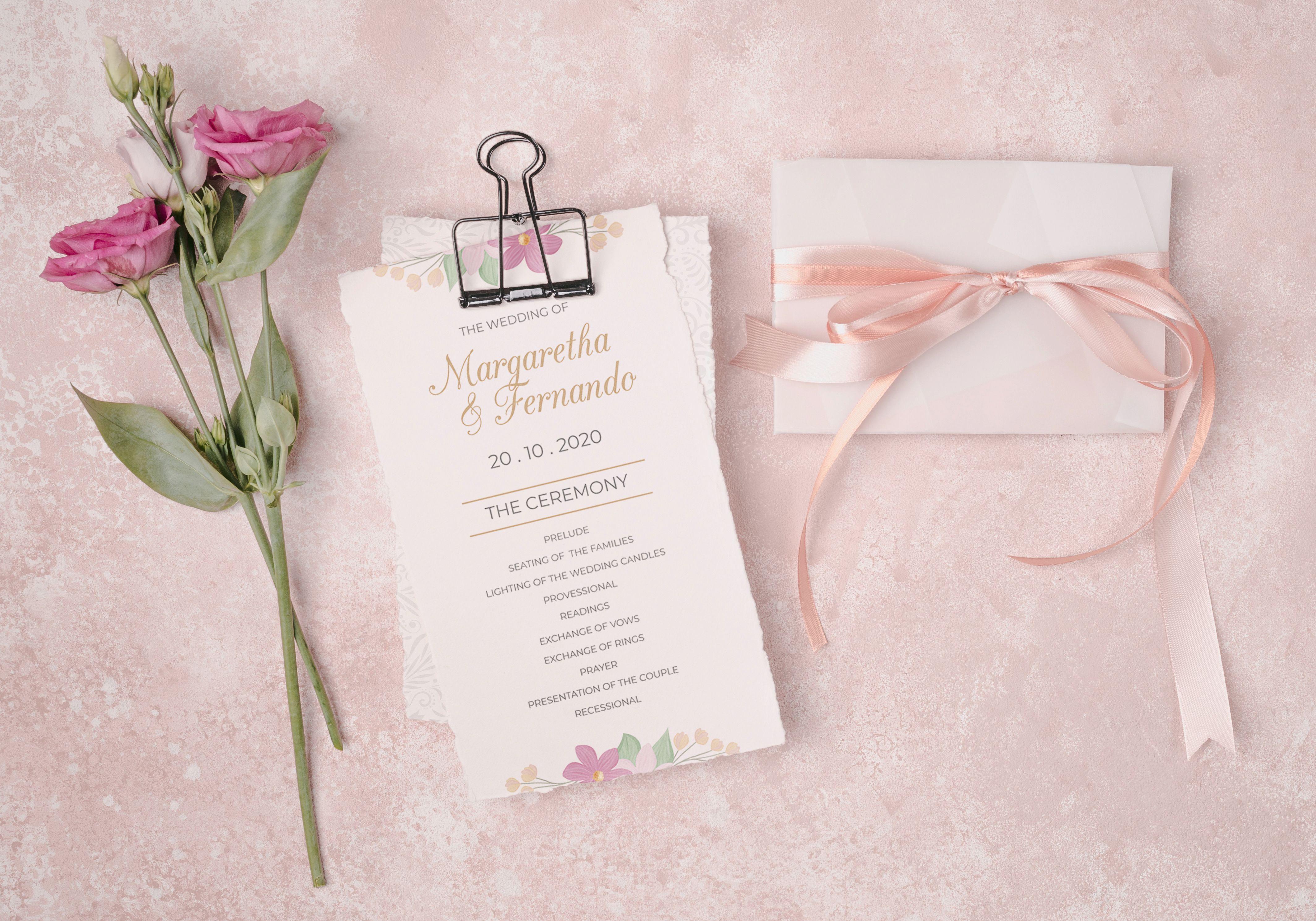 Wedding invitation template on a clipboard with a pink ribbon, flowers, and an envelope on a textured background.