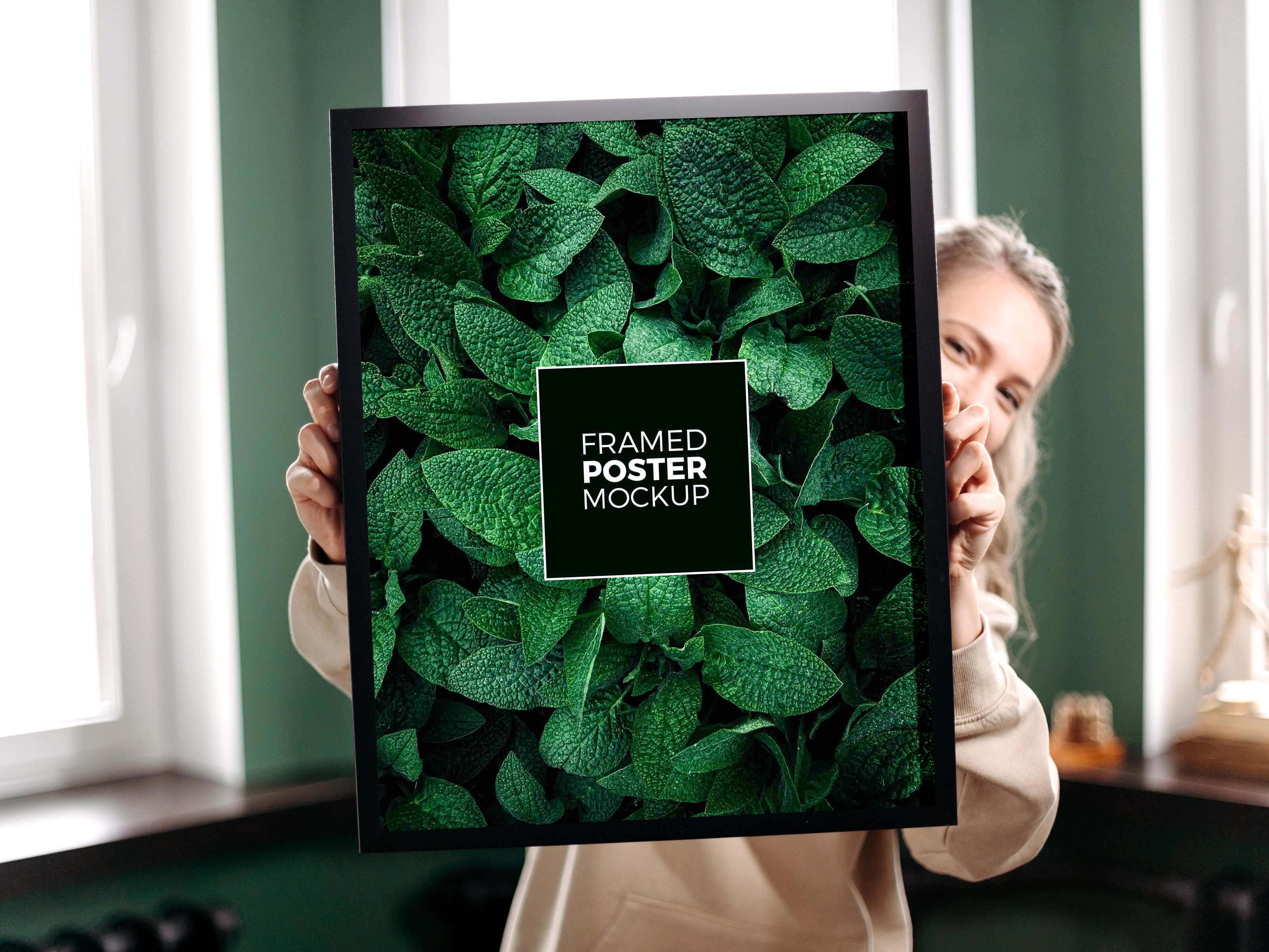 In a cozy indoor setting with green walls and large windows, a person partially hidden behind, holds a framed poster with a vivid, leafy green design. The sleek, black frame accentuates the lush botanical pattern, creating a fresh, inviting look. This mockup is perfect for showcasing your artwork or photography in a realistic home environment. Use this mockup generator to create stunning visuals and share your beautiful designs on social media today!