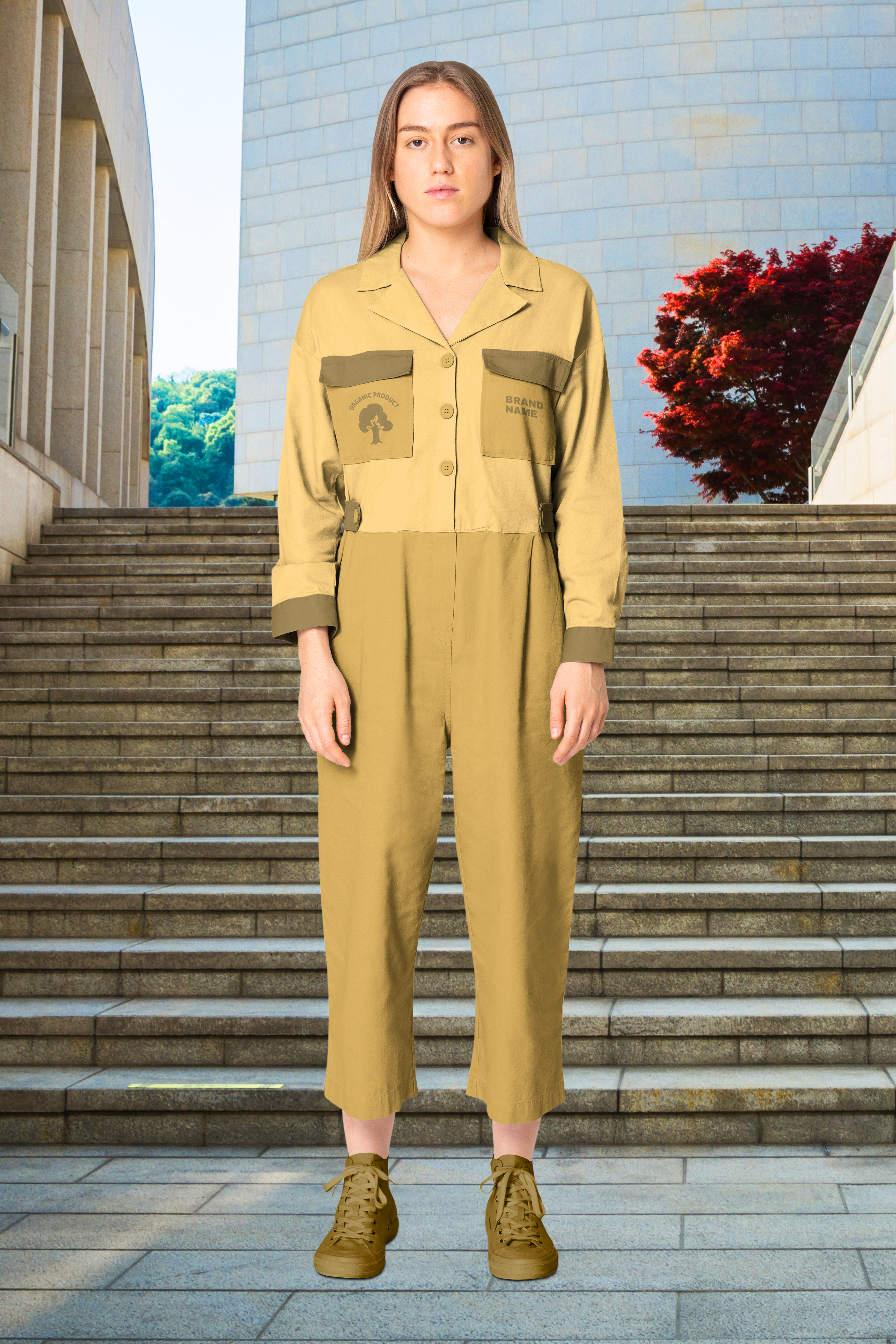 The mockup image features an outdoor urban setting with stone steps and a concrete building in the background, accentuated by vibrant greenery and a striking red tree. The main object is a woman dressed in a stylish beige jumpsuit with contrasting chest pockets and matching shoes. Utilize this mockup to showcase your brand's latest fashion statement in a realistic environment. Use our mockup generator today and share your unique design on social media to captivate your audience!