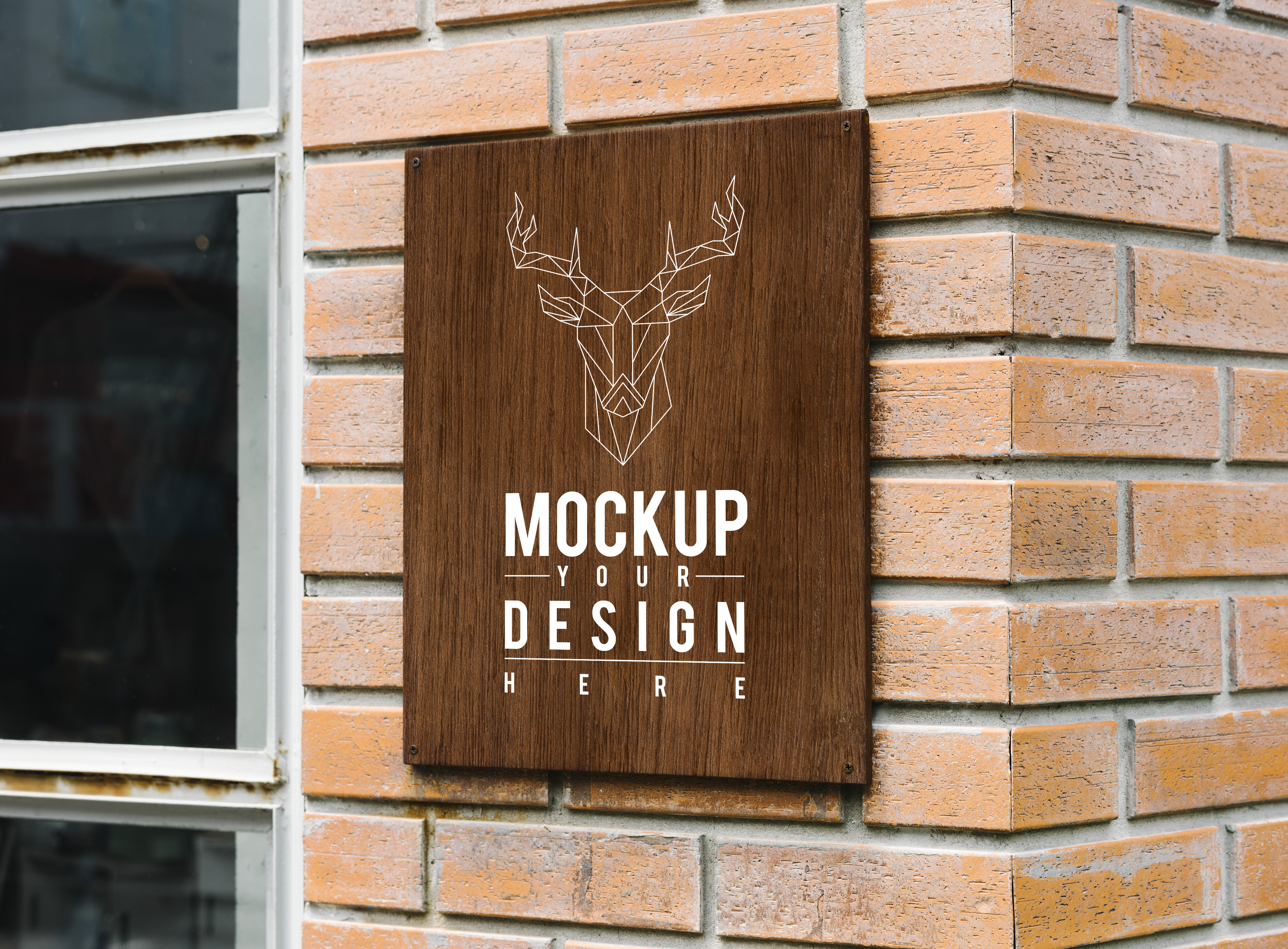 The mockup image displays a wooden signage board mounted on a brick wall in a casual outdoor setting. The main object, a wooden sign, features a minimalist geometric deer graphic above sample text. The warm brown tones of the wood contrast stylishly against the textured orange brick wall. This mockup is perfect for advertising your business or promotional design. Use this mockup generator to personalize your content and share your creative designs on social media today!