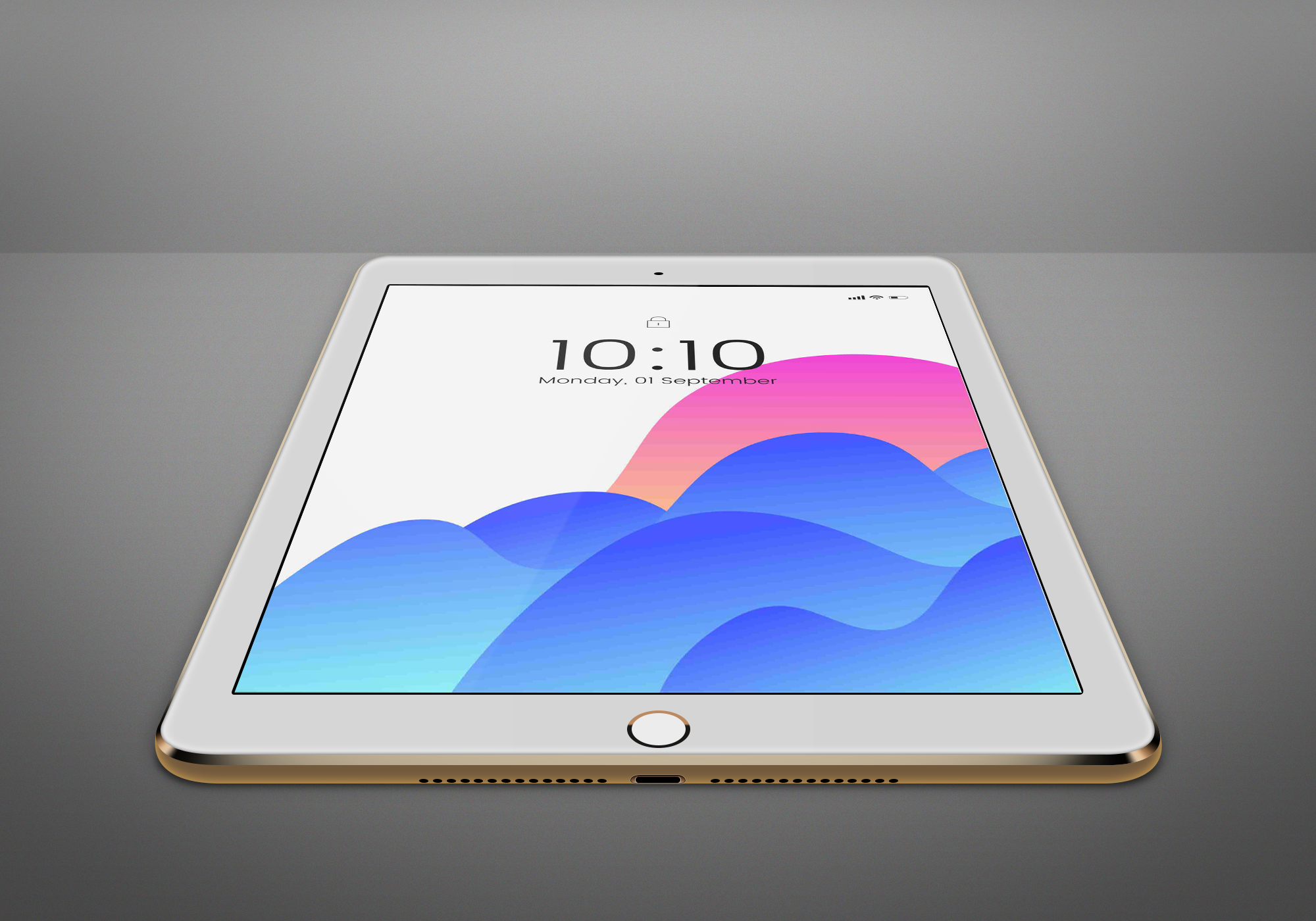 The mockup image features a sleek tablet lying flat in a minimalist grey setting. The tablet has a gold trim with a front-facing camera and fingerprint sensor. The screen displays a vibrant, abstract wallpaper of blue and pink waves. This mockup is perfect for advertising apps, websites, or digital products by showcasing your design on the tablet's screen. Utilize this mockup generator to create stunning visuals and share your designs on social media to engage your audience!